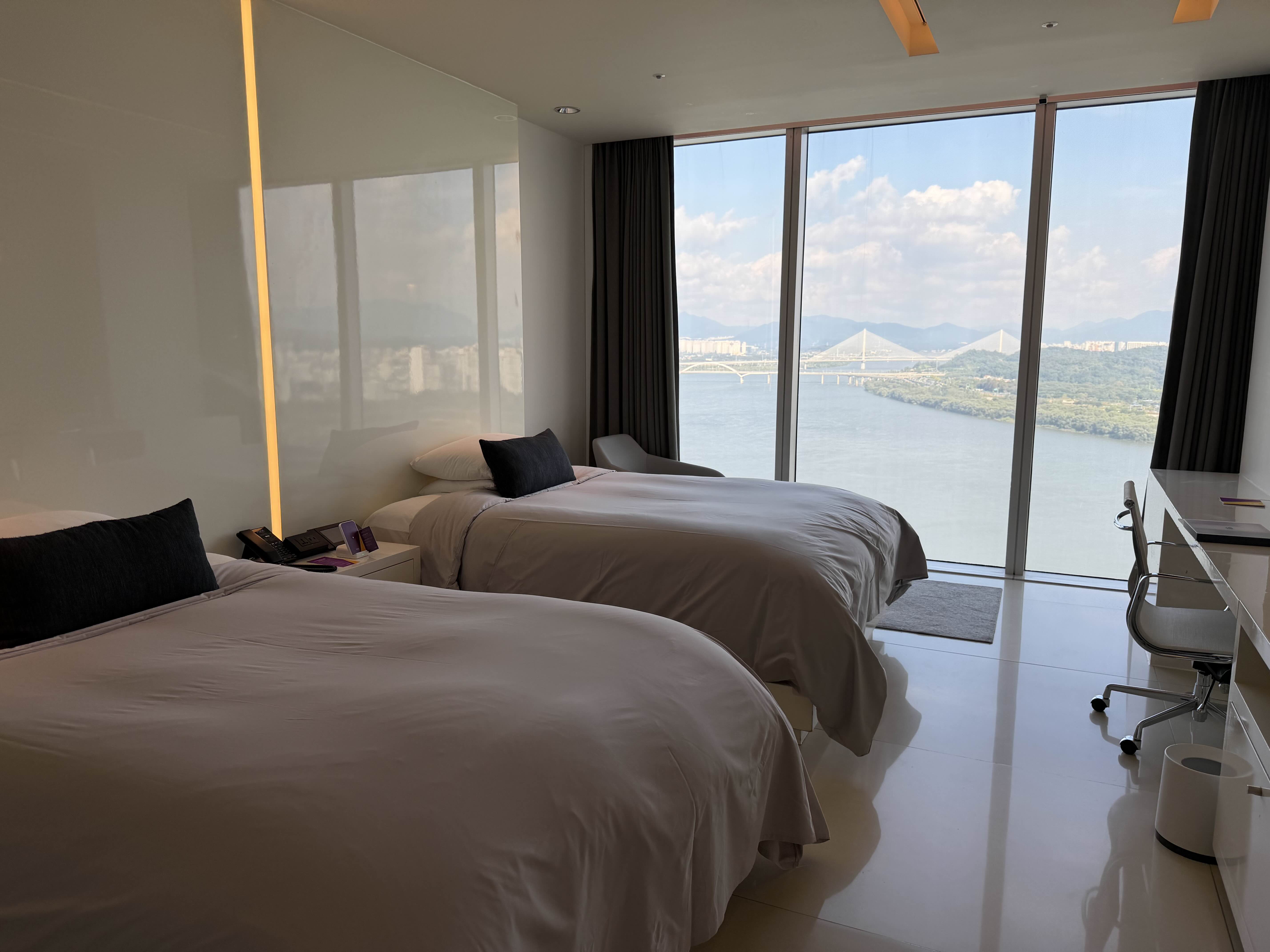 전 날 압구정 모 호텔에 묵었던 감흥이 기억나지 않을 정도로 비교불가, 압도적으로 아름다웠던 워커힐 비스타 서울 의 한강 리버뷰입니다.